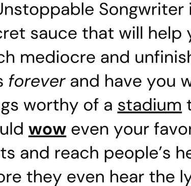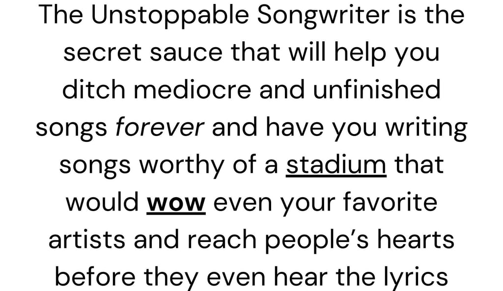 I help songwriters master their craft by tapping into the essential music theory knowledge to take their compositions to the next level. My life changing 8-week course "The Unstoppable Songwriter" uses my proven signature method to teach the expert knowledge I use daily to feel truly unstoppable when I write music.